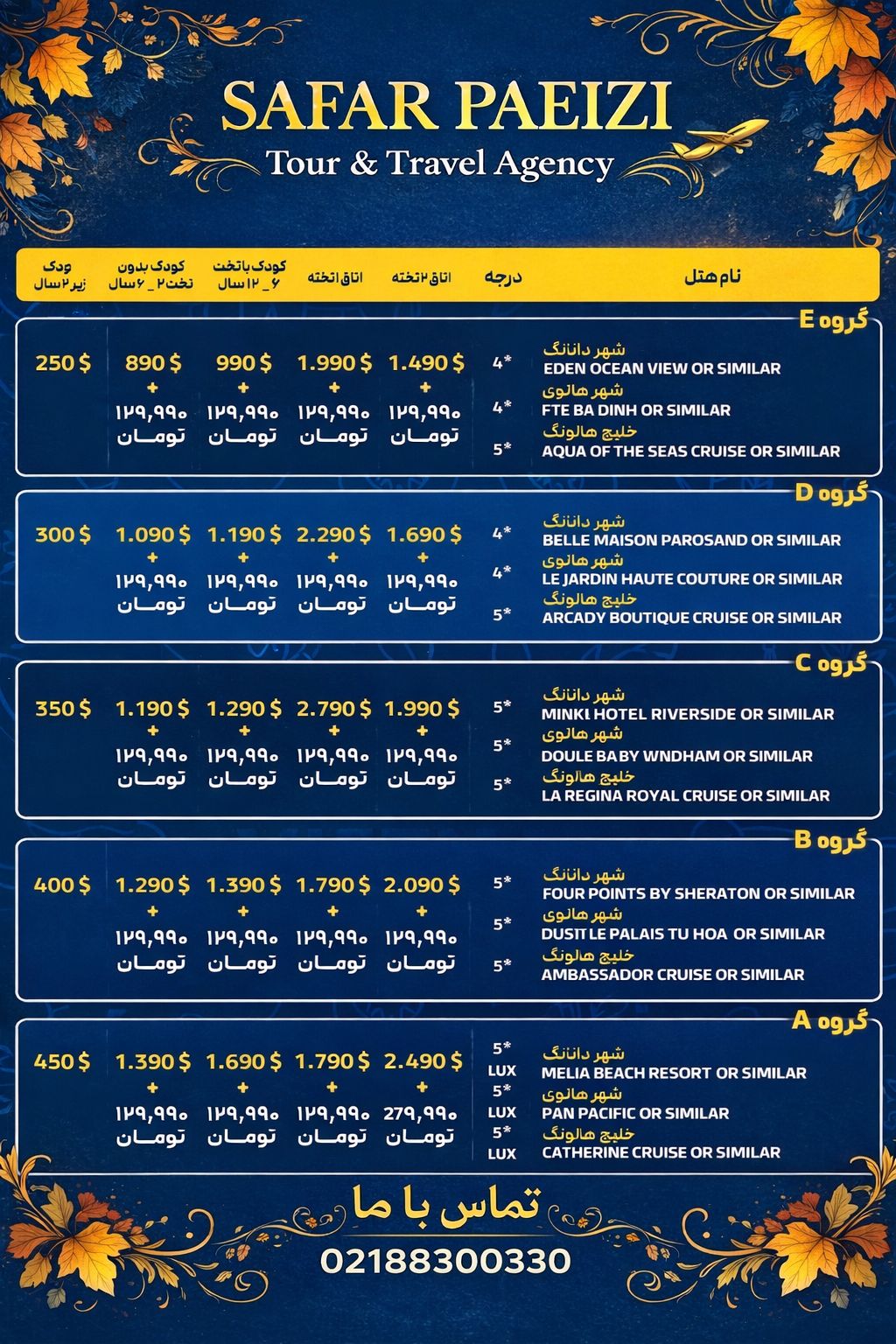 سفر پاییزی تجربه یک سفر رویایی مجری تور های گردشگری تهیه بلیط هواپیما در مسیر های مختلف رزرو تور و هتل و انجام کلیه امور اقامتی در جهان فروش مستقیم تورهای ترکیه امارات روسیه و تایلند خدمات ویزا با کمترین قیمت ممکن فروش بلیط های داخلی و خارجی با کمترین قیمت ممکن در صورت خرید از سایت ویزا توریستی و تجاری روسیه ویزا توریستی و تجاری هند ویزا توریستی تایلند ویزا توریستی آذربایجان ویزا توریستی سنگاپور ویزا توریستی اندونزی ویزا توریستی مالزی