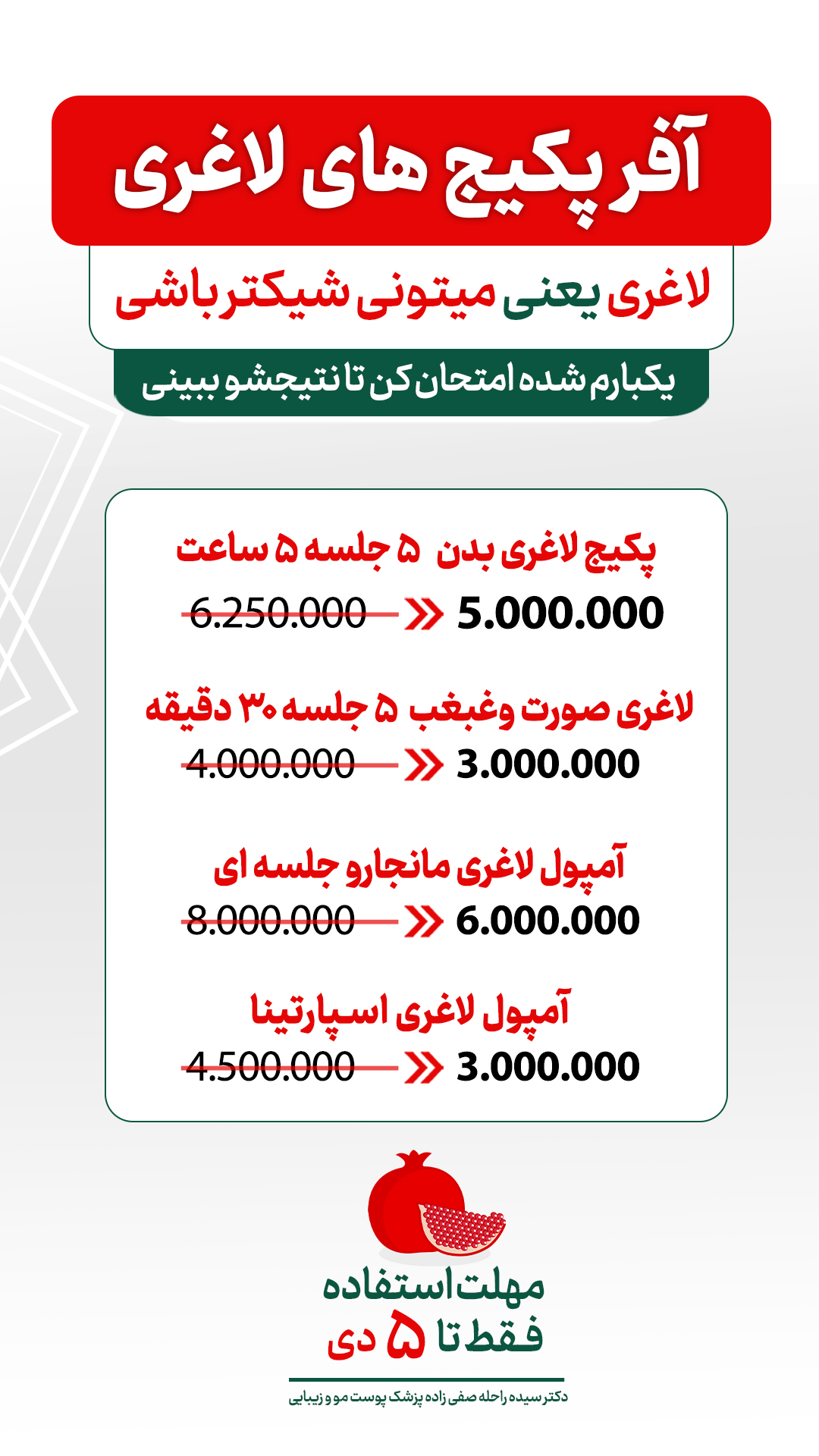 جشنواره یلدا🍉 فقط کافیه تا ۵ دی هرکدوم از خدمات پوست مو و زیبایی مارو که دوست دارین انتخاب کنید ما۲۰ تا ۵۰٪تخفیف به شما هدیه بدیم🍉 ۵۰٪تخفیف هایفوتراپی ۴۰٪تخفیف فیشیال ۲۰٪تخفیف لیزر موهای زائد کاملا بدون درد با سری یکبار مصرف فول بادی فقط ۷۶۰❤️ ٪۳۰تخفیف لاغری موضعی ۵ جلسه یکساعته به جای ۶/۲۵۰/۰۰۰ فقط ۴/۵۰۰/۰۰۰پرداخت کنید❤️ 🦋لطفا برای اطلاع از جزئیات تخفیفها پیج را فالوو کنید و مارادنبال کنید🙏 با کادرپزشکی مجرب و تجهیزات پیشرفته وموادمصرفی مرغوب 💟ویزیت ومشاوره رایگان توسط پزشک 🔻 معرفی خدمات مجموعه 🟥 بخش خدمات پوست، مو، زیبایی و لیزر ✅ معاینه،ویزیت و درمان بیماری های پوست و مو ✅ لیزر موهای زائدبا جدیدترین دستگاه بدون درد۲۰۲۳با سری یکبا ✅ رفع مویرگهای واریسی و تار عنکبوتی با لیزر ✅ تزریق بوتاکس ✅ تزریق ژل و فیلر و مادلینگ وکانتورینگ صورت ✅ هایفو تراپی و لیفت صورت و گردن ✅ پی آر پی مو ( PRP مو ) جهت رویش مجدد موی سر ✅ مزوتراپی مو ✅ مزوتراپی پوست (جوانسازی و رفع لک و تیرگی) ✅ مزوتراپی لاغری (رفع غبغب وچاقی موضعی ✅ برداشت انواع خال و زوائد پوستی ✅ میکرونیدلینگ و مزونیدلینگ ✅ پلاسماجت و پلکسر (رفع افتادگی پلک، کوچک سازی بینی) ✅ فیشیال تخصصی صورت و جوانسازی پوست ✅ رفع و درمان ریزش مو و تقویت و رشد مجدد موها ✅انواع پیرسینگ ✅ پاک کردن تاتو ✅ و ... 🟥 بخش خدمات تخصصی ماساژ ✅ ارائه خدمات ماساژ حرفه ای و پیشرفته (ریلکسی ودرمانی و...) توسط کارشناس مجرب و مربی رسمی ماساژ 🟥 بخش مشاوره تغذیه و تناسب اندام ✅ ارائه رایگان خدمات مشاوره ای تغذیه و رژیم درمانی چاقی و لاغری همراه با آنالیز بدن ✅ لیفت ولاغری موضعی صورت و بدن با دستگاه آراف،کویتیشن وال پی جی