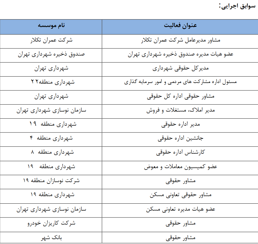 کارشناسی ارشد حقوق خصوصی 12سال سابقه مدیریت جقوقی شهرداری متخصص در پرونده های منابع طبیعی و زمین شهری(املاک ملی و موات شده) متخصص در پرونده های شهرداری انجام کلیه امور حقوقی مربوط به ملک در کل کشور تنظیم کلیه قراردادهای ملکی (مشارکت در ساخت و مبایعه نامه و صلح ...) تنظیم دادخواست و لایحه اخذ گواهی انحصار وراثت و امور وراثتی پرداخت حق الوکاله با توافق طرفین