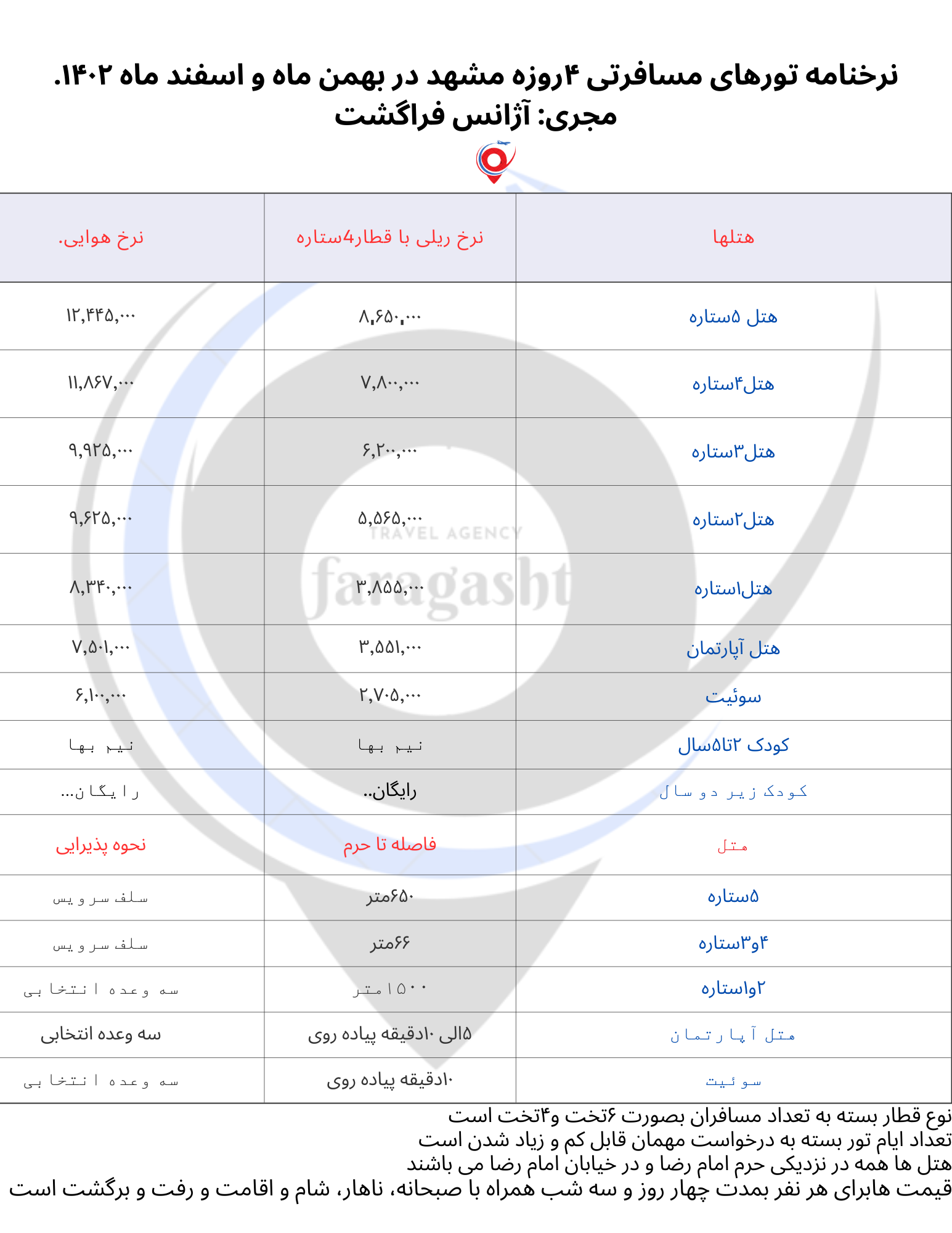 آیا به دنبال یک سفر فوق العاده در مشهد و شهرهای توریستی ایران هستید؟ آژانس مسافرتی فراگشت پهلوان با بیش از 10 سال سابقه کار در صنعت گردشگری آماده ارائه بهترین خدمات به شماست. با همکاری با بیش از 40 هتل لوکس در این مناطق، تجربهای بینظیر از زیبایی ها و آرامش ایران را تجربه کنید. کادر مجرب و حرفهای آژانس فراگشت پهلوان آمادهی برگزاری تورها و سفرهای منحصربهفرد بهترین مناطق توریستی ایران میباشد. آفرها و پیشنهادات ویژه آژانس ما به شما فرصتی بینظیر برای سفرهای خاطرهانگیز ارائه میدهد. جهت کسب اطلاعات بیشتر و رزرو تورها با ما تماس بگیرید و سفری متفاوت به دنیایی از تجربهای شگفتانگیز را تجربه کنید